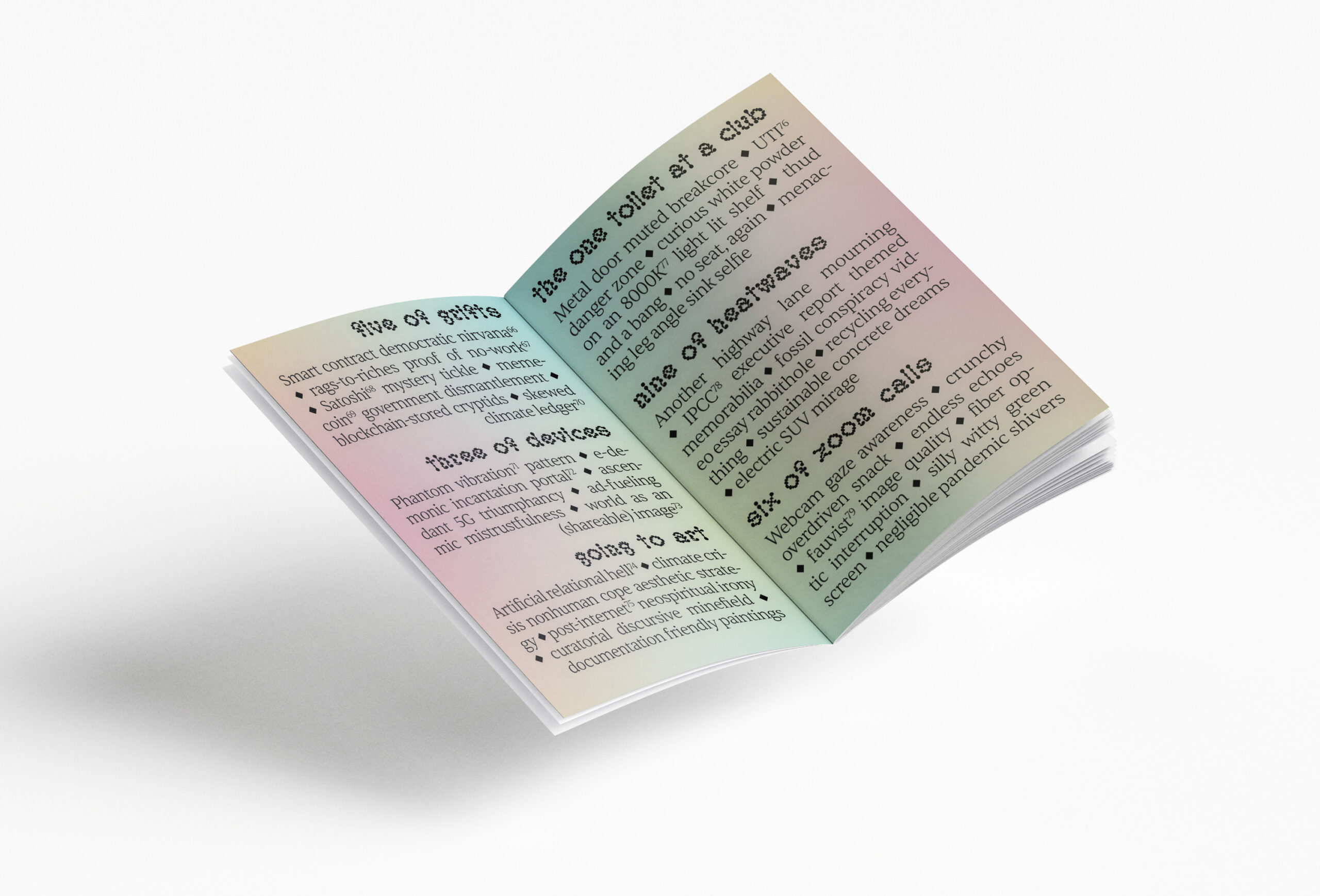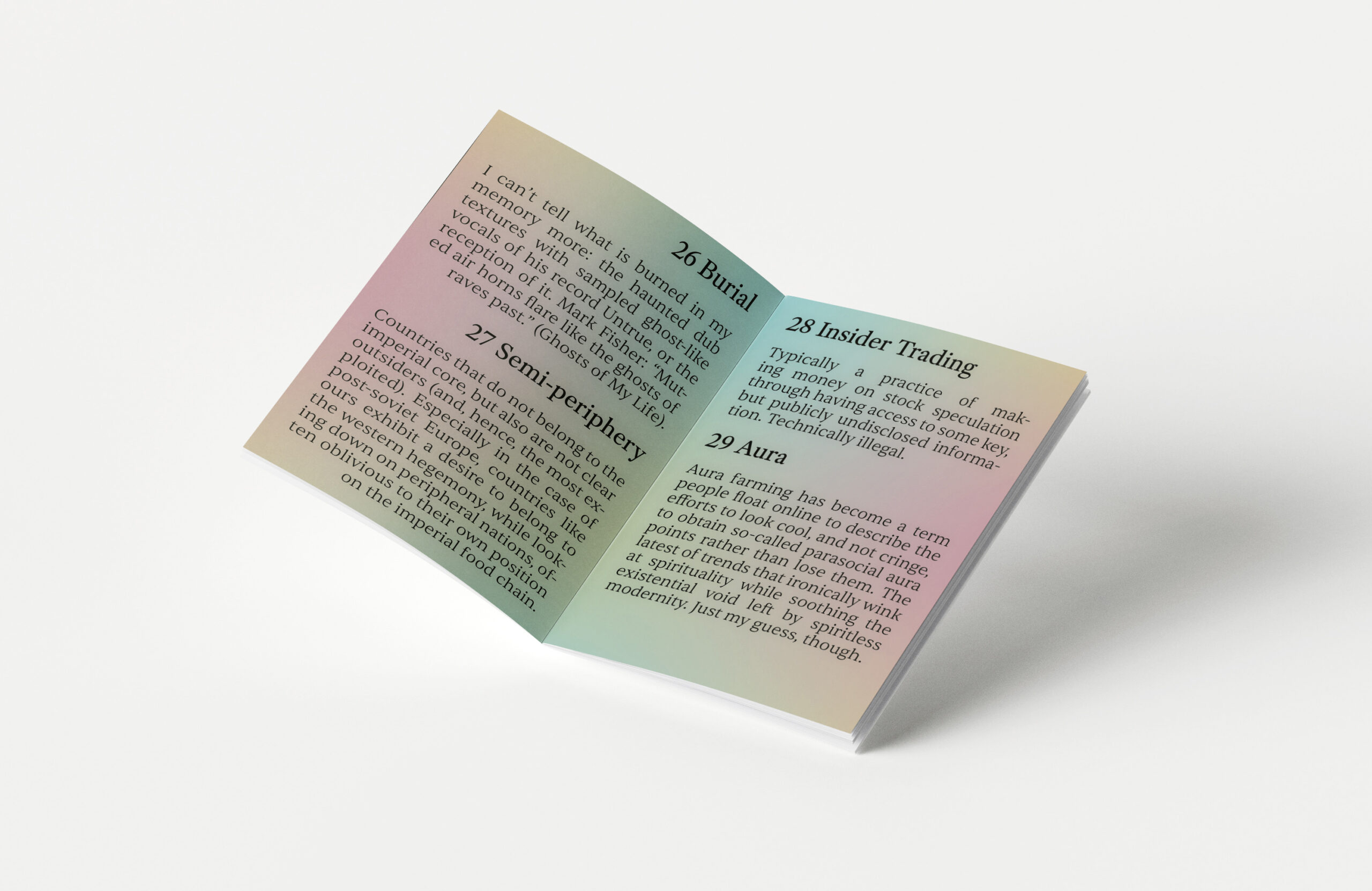 Poetic and literary brochures explain (and „explain“) memestock shorting, hauntology or Neon Genesis Evangelion.
